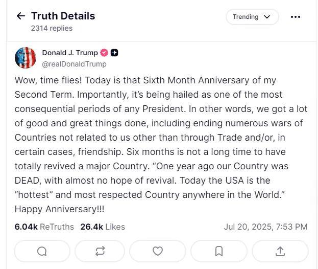 小编:中国经济网络版权中国经济网络新媒体矩阵网络视听计划许可证(0107190)(北京ICP0400 中国经济网络保留的所有权利 中国经济网络新媒体矩阵 在线音频 - 视觉节目许可证(0107190)(北京ICP040090) 7月22日,中国新闻局(Sweet)在7月20日,当地时间,美国总统特朗普去世了,以庆祝他担任美国总统的任期半年。 “哇,时间会飞!现在是我第二学期的半年周年纪念日。”特朗普写道。特朗普总结说:“这一时期必须被认为是他担任总统期间最有影响力的时期之一。换句话说,我们做了许多与我们无关的国家和许多国家的大事,结束了许多与我们无关的战争……”特朗普总结说:“六个月的整个良好的胜利并不长期以来,这是一年前的整个复活。一年前,我们的国家像死亡一样,是久违的人,这是一位久信息。特朗普的“半年报告”,以及170多个执行命令的迹象“大型和美国”法案越来越多地驱逐移民,并宣布紧急情况。在过去六个月的背景下,特朗普显然享受了过去六个月的享受。公众对美国的Axios新闻网络还有其他意见,在这里引起了疑问,称特朗普提到的民意调查“尚不清楚”。该报告还说,许多调查的判决,特朗普仍然面临着国内外人的许多挑战。美联社公共事务研究中心(AP-NORC)的最新民意测验表明,特朗普对几乎所有问题的批准评级少于50%,包括经济,政府支出,贸易,贸易,税收,移民,移民,卫生保健以及美国政府在中东地区。美联社进一步指出,特朗普的关税政策已推动了各种商品的价格,从市场,衣服到家具和工具,通货膨胀率增加到二月的最高水平。根据美国国会预算办公室的一项审查,特朗普的“大与美国”在未来10年内缺乏NG我们的审查增加了3.3万亿美元,并导致1180万美国人失去健康保险。此外,尽管特朗普一再讲话,并声称如果他回到白宫,乌克兰危机将在24小时内结束,直到今天,这场危机的终结仍然很长一段路。 26岁的美国人德威尔(Dwyer)对特朗普的贸易政策发表了评论:“他在世界上让我们笑了,尤其是关税政策。”他还对美国政府为降低杂货价格和医疗保健所做的工作感到遗憾。选民的“主要基础”是 - 特朗普感到焦虑,使许多美国人不满意。华盛顿邮报(Washington Post)提到,特朗普试图将自己的“ be”出售给越来越多的美国人,在过去的六个布万加曼(Buwanganman),《爱泼斯坦案》(Epstein Case)的纸牌报告中,给他带来了新的政治负担。加入特朗普曾承诺透露已故美国商人爱泼斯坦的档案。但是,美国司法部和联邦调查局发布的联合备忘录已决定没有“客户名单”,并且将不会发布与爱泼斯坦案有关的更多文件。这一结论立即引起了“主要“美国人”,甚至是特朗普选民的“主板” - “ Re -Re -Re -America”(MAGA)营地的怀疑和不愉快。弗林(Flynn)在特朗普的第一个学期中担任国家安全顾问,他在社交媒体上发表了一系列文章,要求特朗普重新考虑这一决定:“请理解,爱泼斯坦事件不会消失。大学的评论说。在巨大的压力下,特朗普立即莱说:“不要盯着爱泼斯坦!我不明白(这是什么有趣的)或吸引它的东西。但是事实是,爱泼斯坦周围的误解是固定的吗? (负责编辑:冯胡) 当前网址:https://www.whzyswim.com//a/keji/711.html 你可能喜欢的: 我 - 逮捕了当地的乡村 新的太空服和健身设备 Fashilong在1年和1个时期 自14五年计划以来,医 如何判断这是否是文化 同事称他为“兄弟pin 政府计划只能提供吗? 教育部:安排和实施数 击败边框:带border的百 基于变化,促进舌头消